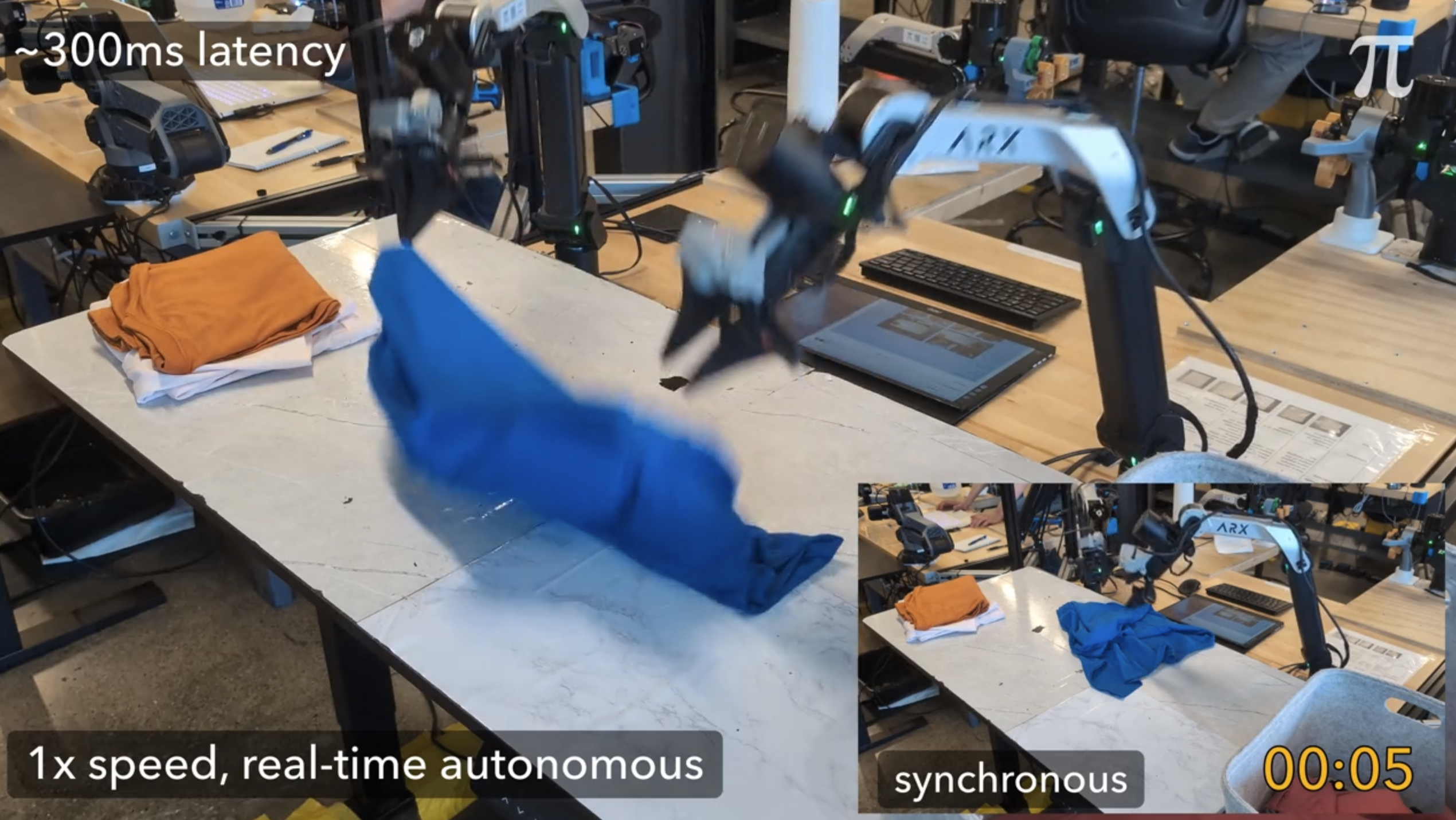 同社のπ0やπ0.5などのモデルでは、50個のアクション(約1秒分)をまとめて処理する「アクションチャンキング」を採用していたが、チャンク切り替え時に動作の不連続性が生じ、危険な加速や制御不能な動きを引き起こす問題があった。これまでは各チャンクの実行後に一時停止して次の処理を待つ同期方式を採用していたため、動作が不自然になり、処理速度も低下していた。